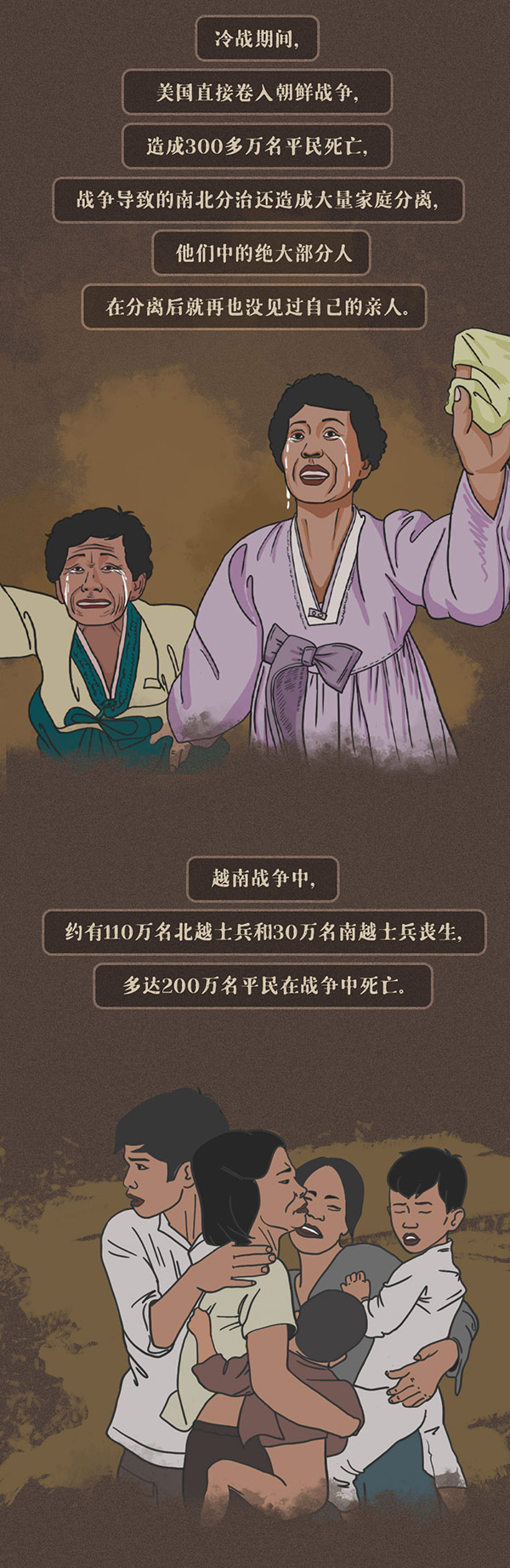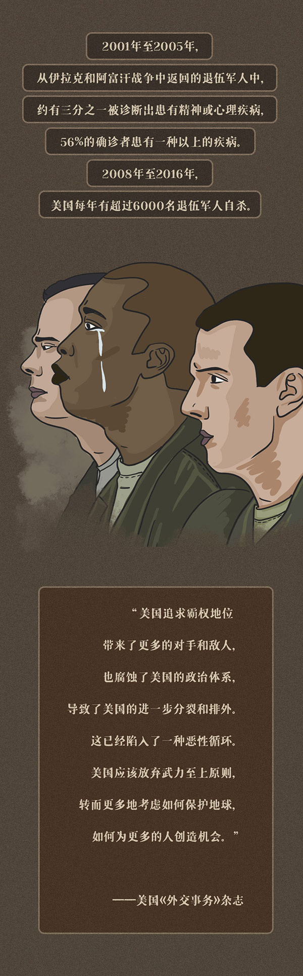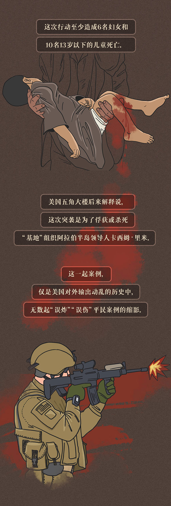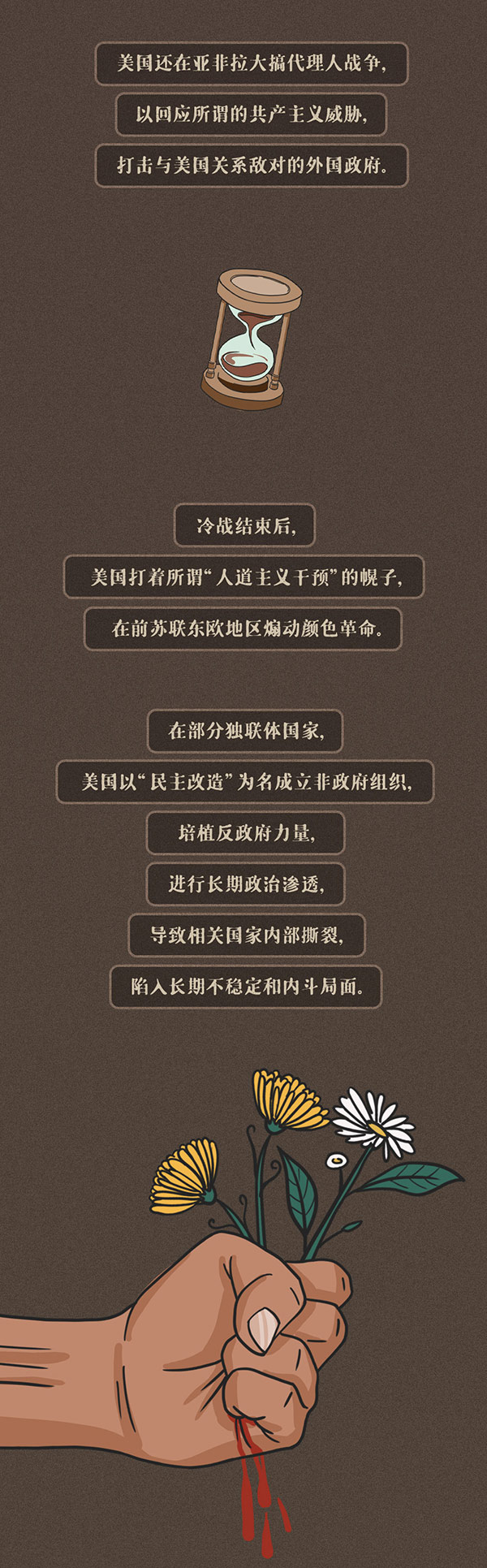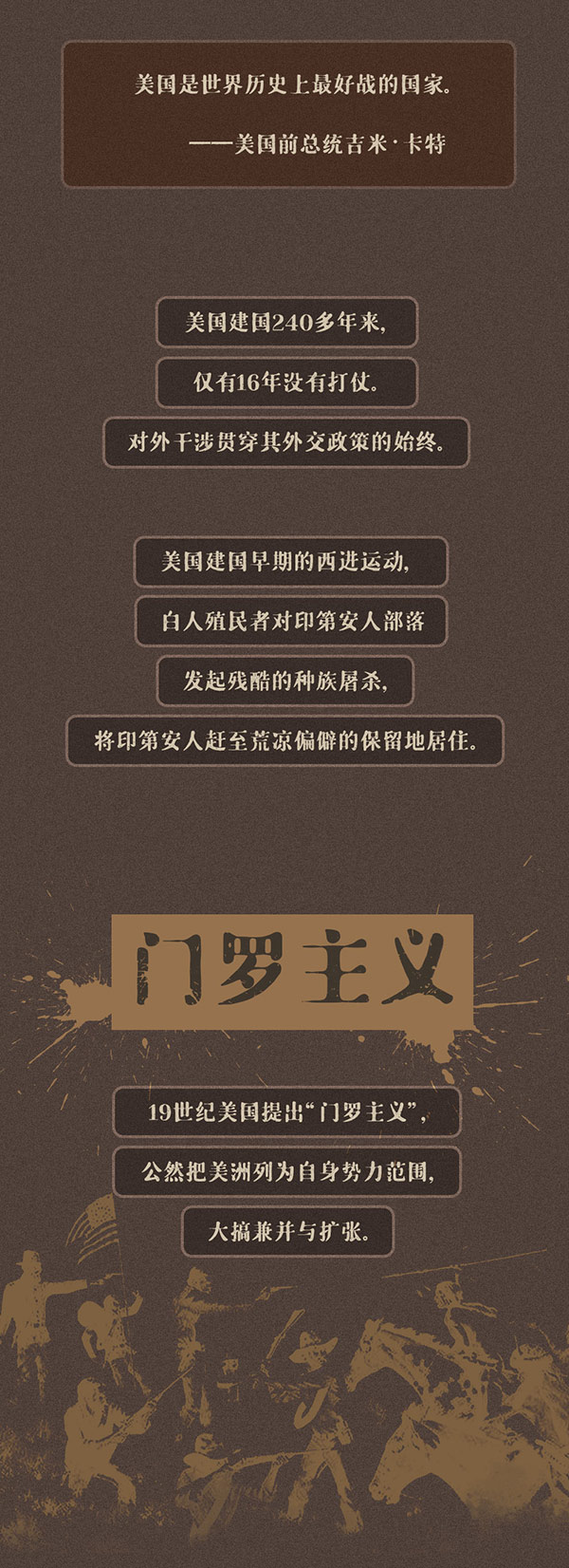 编者按:美国前总统吉米·卡特曾指出,美国是世界历史上最好战的国家。美国建国240多年来,仅有16年没有打仗。由于执迷于对外干涉和制度输出,美国的行为让多少个原本平静的国家山河破碎、生灵涂炭,无数家庭妻离子散、骨肉分离。时代大潮滚滚向前,任何倒行逆施都不得人心,也不可能长久。奉劝美国停止以霸凌行径挑战国际关系准则,尊重以联合国为核心的国际体系,坚守和平、发展、公平、正义、民主、自由的全人类共同价值,成为世界和平与发展事业的推动者而非破坏者。
