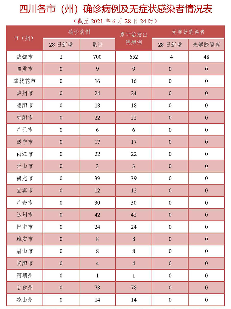 6月28日0—24时,四川新增新型冠状病毒肺炎确诊病例2例,均为境外输入: