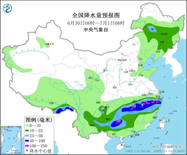 南方入汛以来最强降雨过程仍在持续。今天(6月29日)强降雨将集中在广西北部、江南北部等地,明天强降雨将连成一片,范围达到本次过程最大,从广西北部至浙江、安徽南部将有成片的大到暴雨甚至大暴雨。同时,未来三天,华北和东北地区等地多雷阵雨天气。