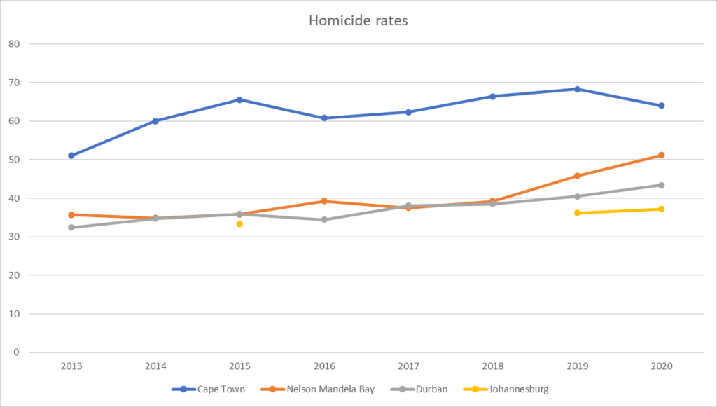 开普敦每10万人出现谋杀案件64件,排名第10;伊丽莎白港每10万人出现谋杀案件51.19件,排名第22;德班每10万人出现谋杀案件43.38件,排名第31;约翰内斯堡每10万人出现谋杀案件37.19件,排名第40。这四座城市排名正在逐年靠前,开普敦从2013年的第20名,已升级到2020年的第10名。据南非警方公布的2021年第一季度数据显示,该国每26分钟就有一人因抢劫或谋杀等暴力犯罪死亡。(总台记者 周涛)