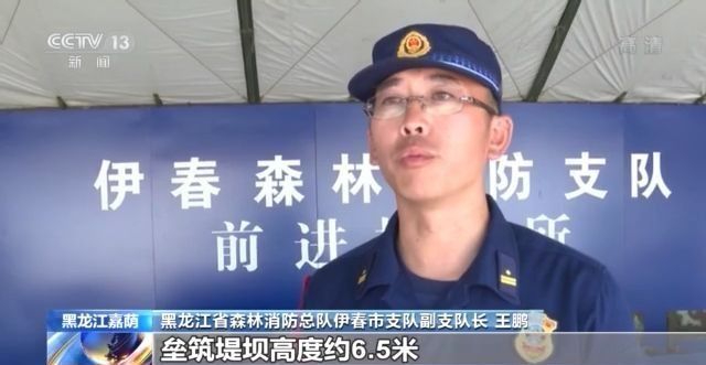 黑龙江省森林消防总队伊春市支队 副支队长 王鹏:截至目前,(我们)支队已经累计装填搬运沙袋五万余袋,垒筑堤坝高度约6.5米高,已经成功将嘉荫口岸的一号闸口和三号闸口进行成功封堵。目前,我们正在按照这个省水利专家的要求,正在装填沙袋。