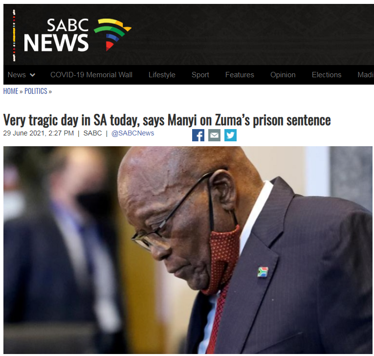 据南非国家广播公司当地时间6月29日报道,当日南非前总统祖马因藐视法庭被南非最高法院(宪法法院)判决入狱15个月。