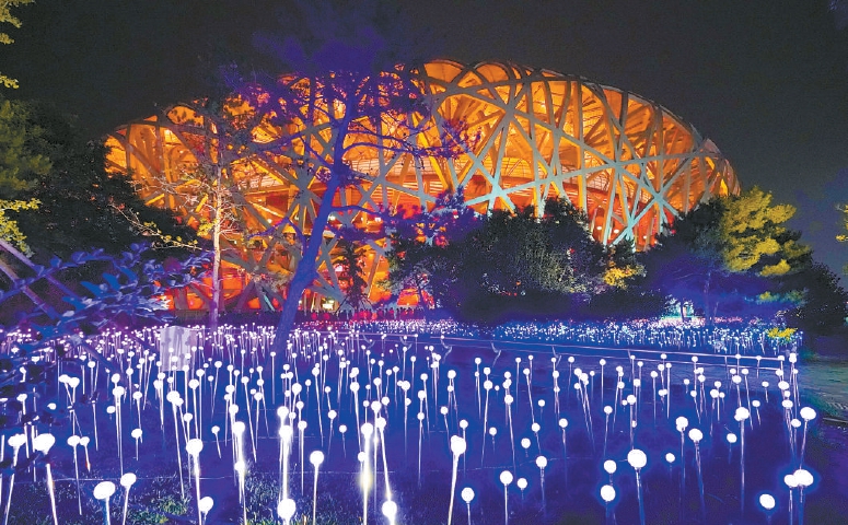 在球形灯组成的“花海”簇拥下,在奥林匹克塔灯光秀的映衬下,鸟巢璀璨夺目。 本报记者 方非摄