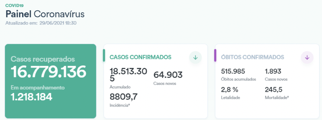 截至当地时间6月29日18时30分,据巴西卫生部发布的数据,全国新冠肺炎确诊病例累计达18513305例,单日新增确诊病例64903例;累计死亡病例515985例,单日新增死亡病例1893例;累计治愈病例16779136例。