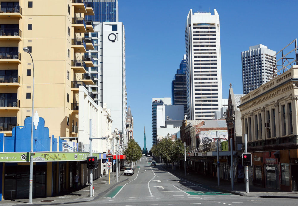 澳大利亚西部城市珀斯从4月24日凌晨开始实施三天封城。图为当日在珀斯拍摄的冷清的街道。(新华社发,周丹摄)
