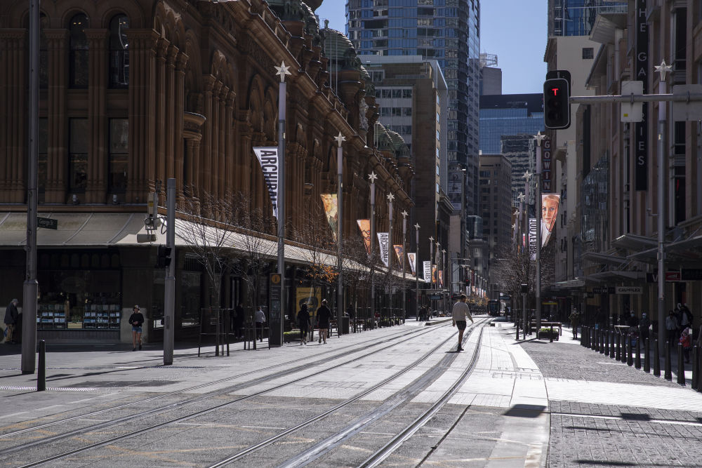 由于新冠病例增多,澳大利亚新南威尔士州6月26日宣布包括第一大城市悉尼在内的多个地区再次进入封城状态。图为当日拍摄的悉尼市中心空旷的街道。(新华社记者白雪飞摄)
