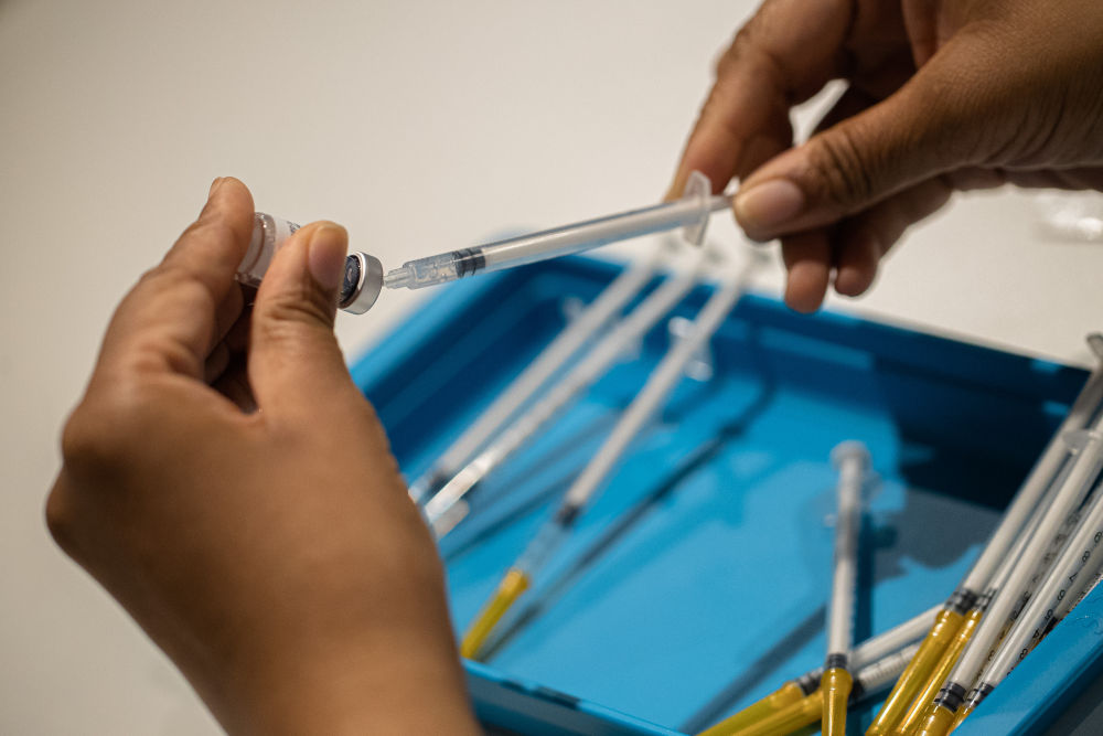 5月28日,工作人员在法国巴黎凡尔赛门展览中心设立的疫苗接种中心进行疫苗准备工作。(新华社发,奥雷利安·莫里萨尔摄)