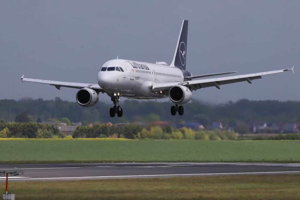 5月21日,汉莎航空的一架航班准备在比利时布鲁塞尔机场降落。(新华社记者郑焕松摄)
