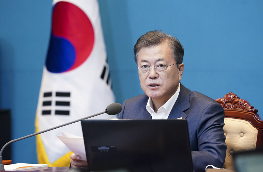 2020年4月27日,韩国总统文在寅在首尔青瓦台主持会议。(新华社发,青瓦台供图)