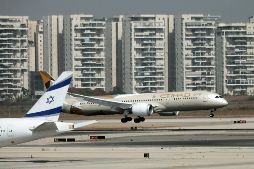 2020年10月20日,阿拉伯联合酋长国代表团所搭乘的客机在以色列本古里安国际机场降落。(新华社/基尼图片社)