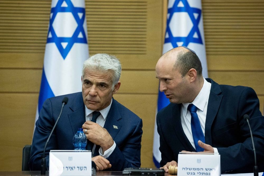 6月13日,以色列新任总理贝内特(右)和外交部长拉皮德在耶路撒冷参加新一届政府第一次内阁会议。(新华社/基尼图片社)