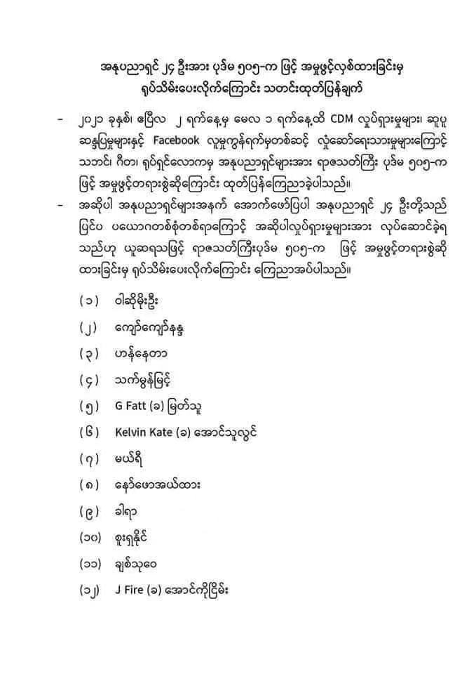 今年4月,缅甸国家管理委员会指控这些演艺人员利用其知名度,支持抗议活动、支持非法组织联邦议会代表委员会、鼓动公务人员参加罢工,后对这些演艺人员进行拘捕,并以违反缅甸《刑法》505条A款起诉了他们。(总台记者 王悦舟)
