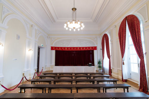 这是2017年5月11日在俄罗斯首都莫斯科拍摄的修复后的中共六大会场。新华社记者 白雪骐 摄