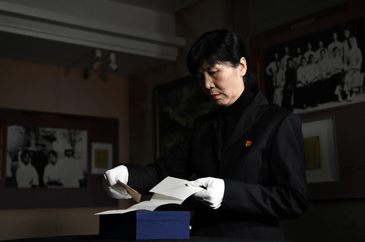 周恩来邓颖超纪念馆陈列保管部副主任李勤从一个蓝色小箱子中拿出列席证(2020年12月23日摄)。新华社记者 李然 摄