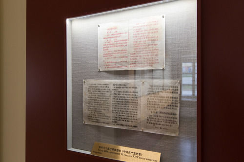 这是2017年5月11日在俄罗斯首都莫斯科拍摄的中共六大会址常设展览馆展出的《中国共产党党章》。新华社记者 白雪骐 摄