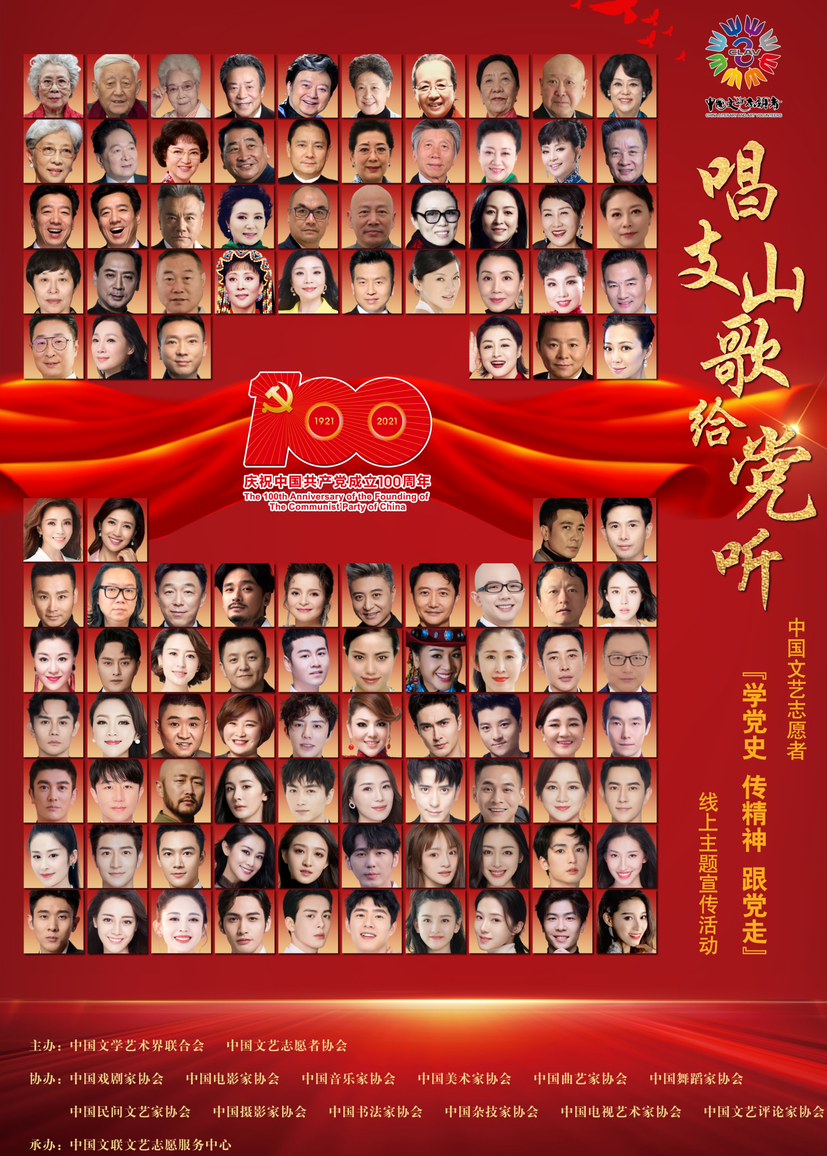 郭淑珍、徐晓钟、田华、李光羲、胡松华、陶玉玲、李明启、才旦卓玛、尚长荣、邓玉华、赵汝蘅、瞿弦和、耿莲凤、姜昆、卢奇、关牧村、范迪安、王丽云、殷秀梅、刘全利、刘全和、张秋歌、阎维文、邓宝金、温玉娟、臧金生、孟广禄、吴琼、杨凤一、张凯丽、岳红、刘劲、杨越峦、宗庸卓玛、李丹阳、张泽群、阎青妤、韩再芬、黄华丽、田英男、林永健、吕薇、康辉、于月仙、王宏伟、赵雨薇、朱迅、费茂华、颜劲松、黄渤、王舸、吴碧霞、周炜、涂松岩、黄豆豆、刘和刚、平安、春妮、颜丹晨、王丽达、张蕾、孙毅、徐子崴、茸芭莘那、李馨曌、吴正丹、保剑锋、王凯、李云迪、贾玲、苗阜、周澎、王小玮、乌兰图雅、高伟光、黄训国、降央卓玛、杜江、曾明、黄轩、罗晋、李德戈景、杨幂、陈晓、云朵、扎西顿珠、楼胜、云飞、陈燕妮、于朦胧、颖儿、尹颂、张韬、梦然、宋靖、白宇、骆文博、张天爱、马佳、迪丽热巴、古力娜扎、张彬彬、胡玉婷、曾舜晞、刘昊然、宋祖儿、李响、姚亮、何林谦、李美静等110余位老中青三代、体制内外各艺术门类知名艺术家录制短视频,结合自身的文艺实践感悟和心声,用真挚朴实的言语抒发爱党爱国的初心与情怀,共同“唱支山歌给党听”。