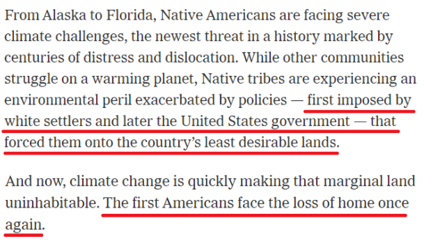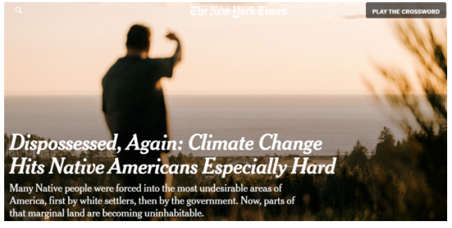 《纽约时报》对美国15个原住民部落进行采访调研后发现,这些社区中质量不佳的住房和基础设施难以应对气候变化等自然灾害。而由于联邦政府的长期忽视,原住民社区通常比其他美国人社区更难得到政府的帮助。