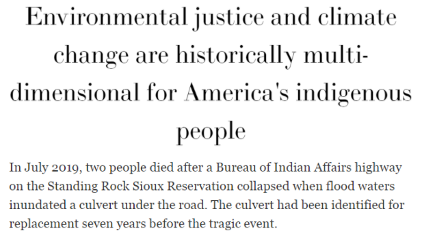 以南达科他州为例。该州原住民领袖长期以来一直在呼吁白宫为其部落内的基础设施建设提供资金,但他们的要求一再遭到拒绝,并酿成了致命后果:2019年7月,洪水淹没了当地洛克苏部落保留地内的一处涵洞,导致横跨其上的公路坍塌,造成两人死亡。而早在悲剧发生的7年前,这处涵洞就已被确定亟需重建。