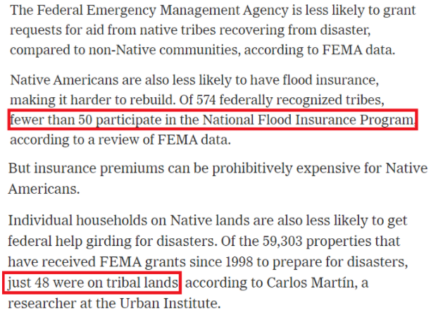 以两个数据为例:由于保费高昂,574个得到美国联邦政府认可的原住民部落中只有不到50个参与了国家洪灾保险计划;自1998年以来,美国共有近6万处房产获得联邦应急管理局的防灾拨款,但其中只有48处位于原住民保留区。
