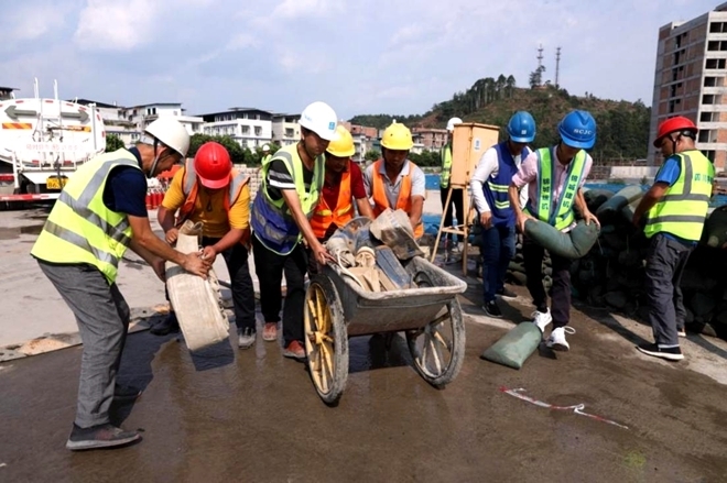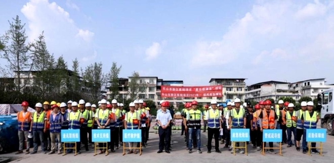 四川在线消息(杨翰文)为保障项目安全生产平稳运行,提高项目应急抢险处置能力,6月28日,中建三局乐山市新区医院建设项目组织项目全体员工开展2021年防汛、消防应急演练。