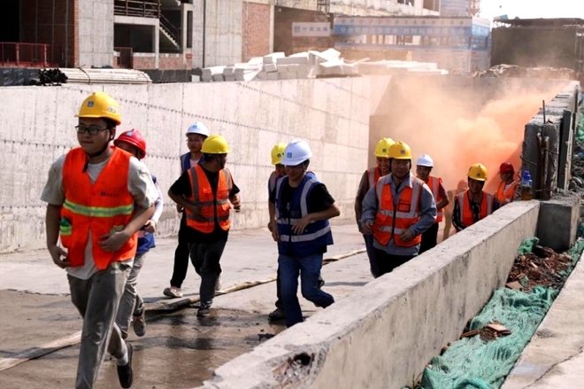 消防应急演练模拟焊接作业过程中因火花飞溅导致地下室易燃材料着火,应急抢险队伍通过抢险流程普及消防器材使用方法,火源扑救要点,作业人员遇险撤离注意事项等消防应急知识,提高项目及观摩人员应急救援基础能力。