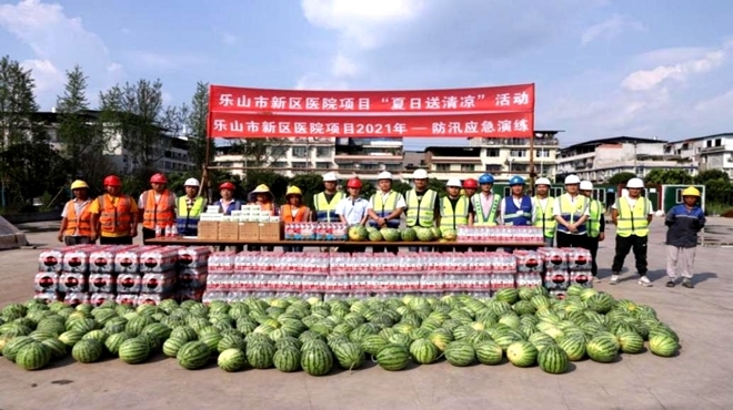 在防汛、消防应急演练之后,乐山新区医院项目部联合项目业主、监理开展“夏日送清凉”活动,将西瓜、饮料、藿香正气液等清凉消暑物资,送到奋战在高温一线的作业人员手中,对他们的辛勤付出表示感谢。