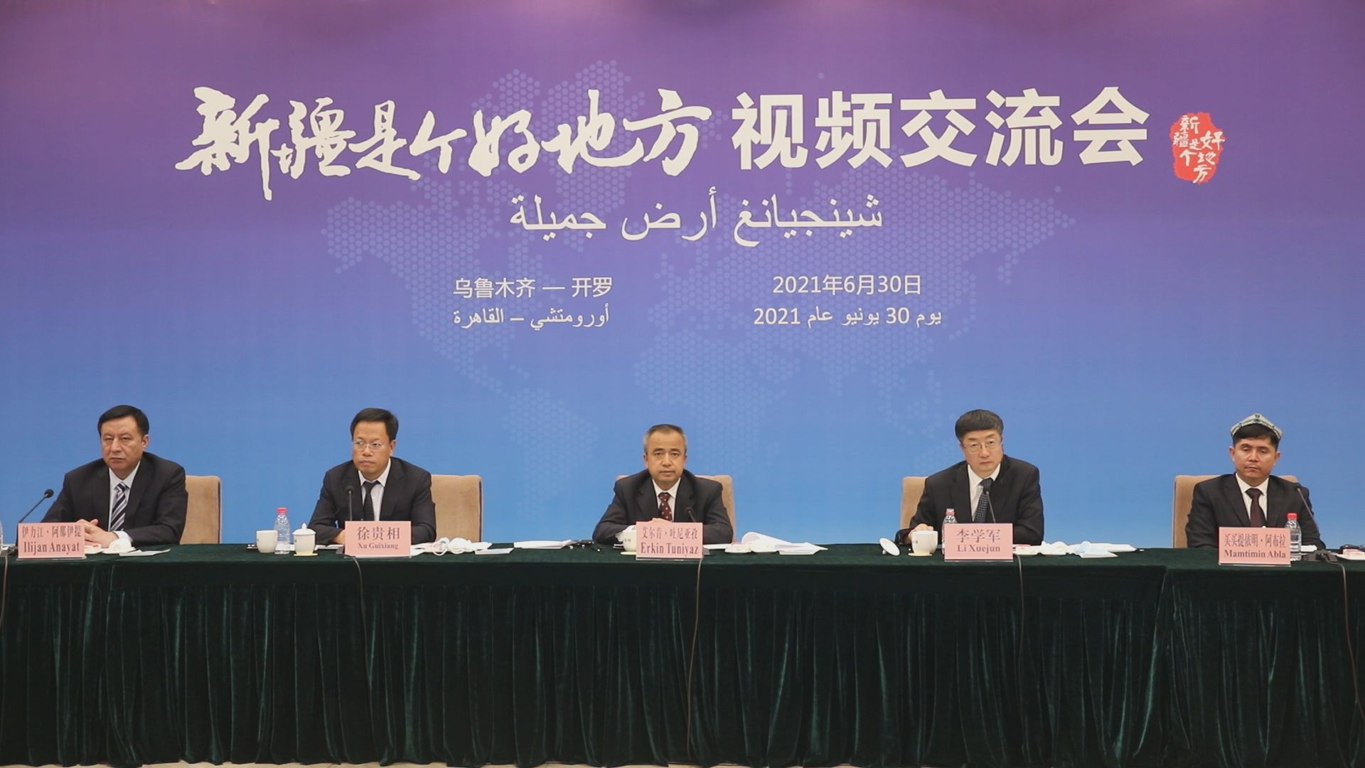 6月30日下午,“新疆是个好地方”视频交流会在乌鲁木齐举行,这次交流会由中国驻埃及大使馆和新疆维吾尔自治区人民政府共同举办。中国和埃及两地各界人士通过视频连线的方式交流互动,展示新疆稳定发展成就,批驳美西方反华势力谬论。