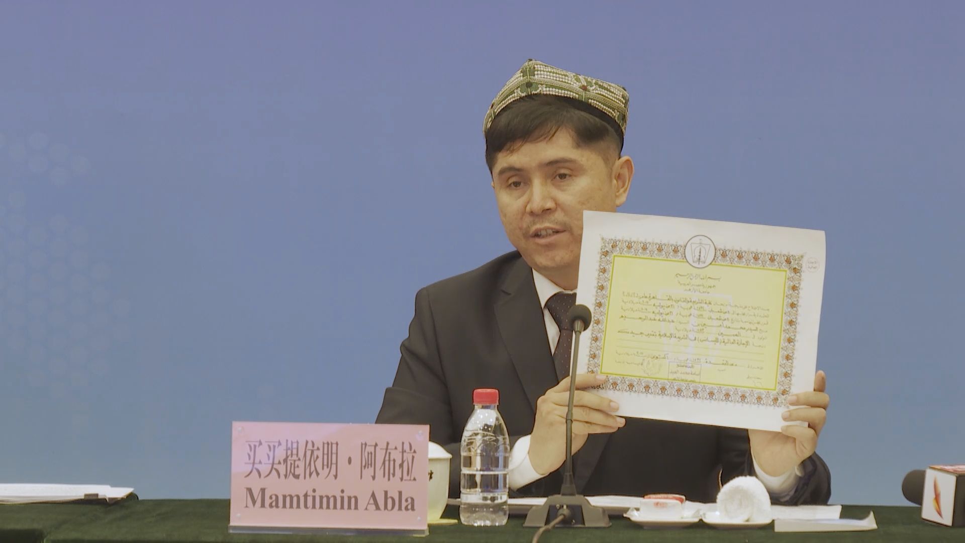 视频交流会上,新疆维吾尔自治区党委常委、人民政府副主席艾尔肯·吐尼亚孜介绍了新疆稳定发展情况。与会的新疆宗教人士、群众代表现场发言。新疆伊斯兰教经学院教师买买提依明·阿布拉曾被中国伊斯兰教协会选派到埃及爱资哈尔大学伊斯兰教规系留学,获得学士学位。他结合自身经历,介绍了新疆宗教信仰自由情况,揭露“限制宗教信仰自由”等谎言。