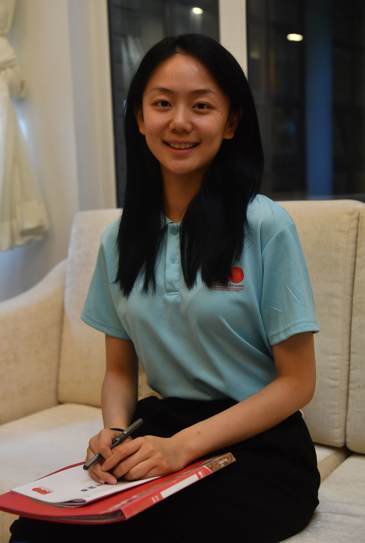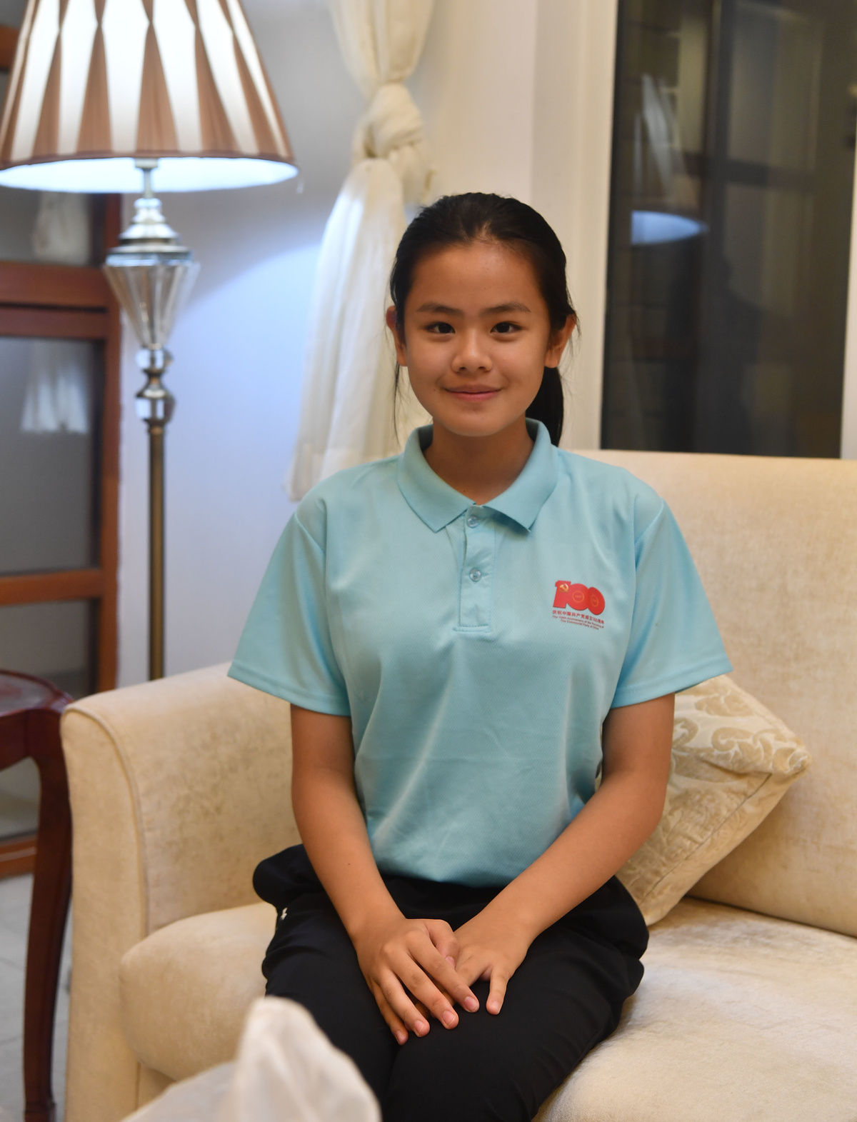 来自朝阳区陈经纶中学劲松分校的杨雅淇才上初一,个头儿已经快一米七了,说话时语气轻柔甜美,笑起来嘴角还有两个小酒窝。经过层层选拔,她凭借出色的表现最终入选10人组成的领诵预备队。