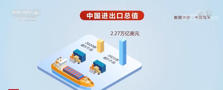 据中国海关统计,今年前5个月中国进出口总值2.27万亿美元,同比增长38.1%,比2019年同期增长26.8%。其中,出口1.24万亿美元,同比增长40.2%,比2019年同期增长29%;进口1.03万亿美元,同比增长35.6%,比2019年同期增长24.3%;贸易顺差2034.5亿美元,同比增加70.2%。