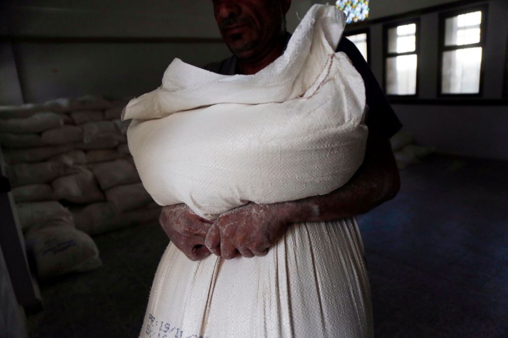 1月26日,也门首都萨那一个救济粮发放站的工作人员向民众发放由世界粮食计划署资助的救济食品。(新华社发,穆罕默德摄)