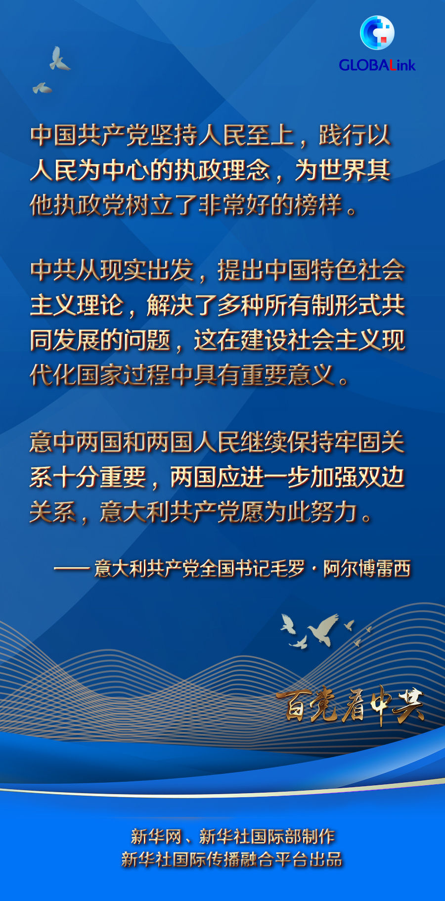 阿尔博雷西说,一百年来,中国共产党带领中国人民取得了巨大成就。中共积累的经验是国际共产主义运动史上的亮点,中共在国际共运历史上树立了重要标杆。