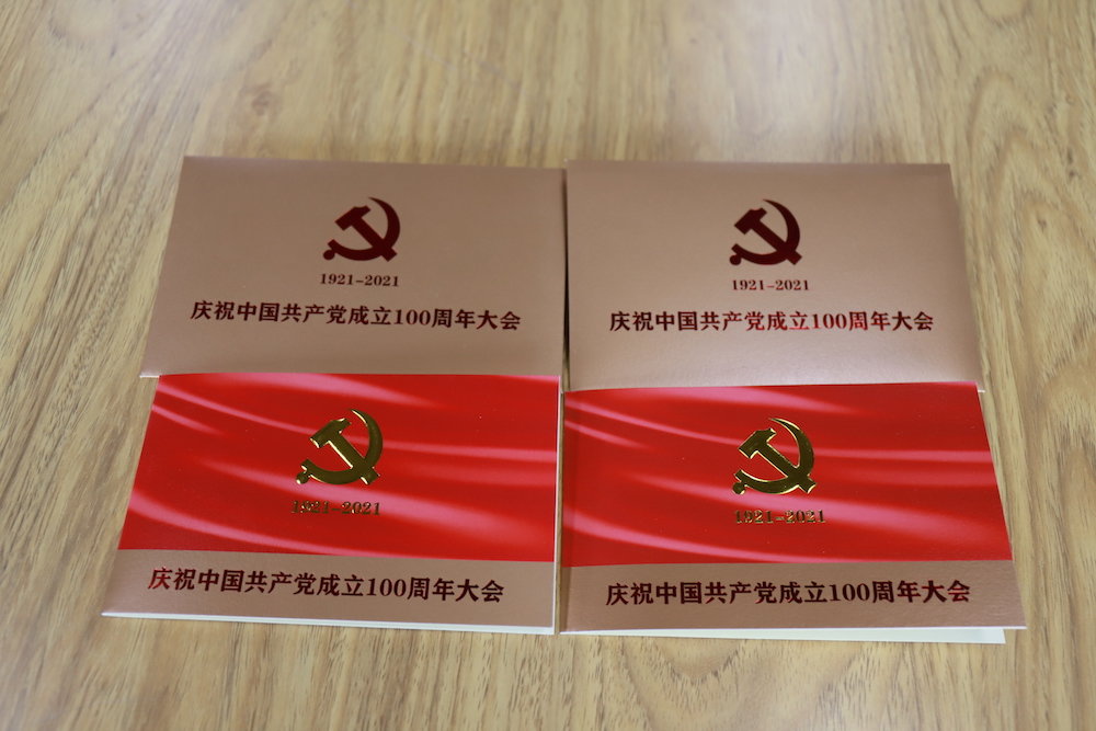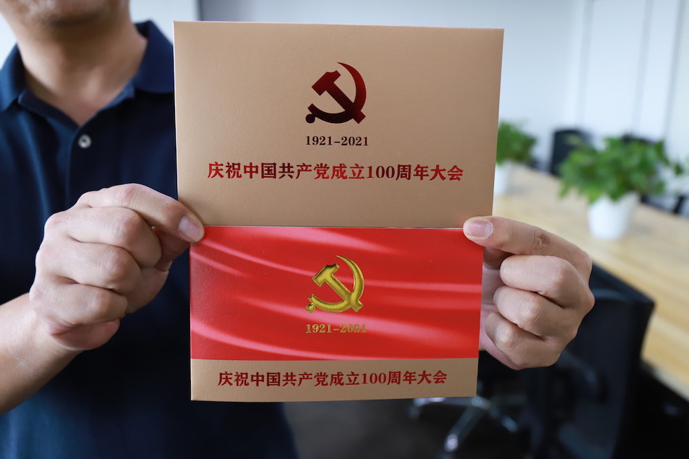 虽然设计元素“简约”,这封请柬可一点儿也不“简单”。 郭缜介绍,“在配色方面,我们选用了红色与金色的搭配,凸显庄重大气。党徽使用专色金印刷,运用烫金工艺,具有金属的质感;‘庆祝中国共产党成立100周年大会’则选用了红金色,整体呈现出凹凸立体的印刷效果,让视觉层次更加丰富。”
