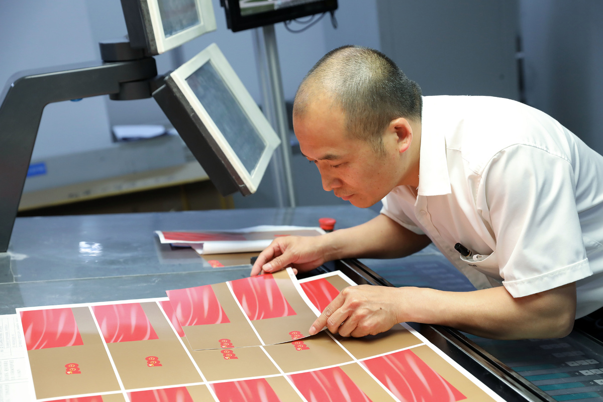 技术人员认真审看刚刚打印完成的请柬版样,努力做到颜色与模板分毫不差,为下一步印制图案和字体做好准备。