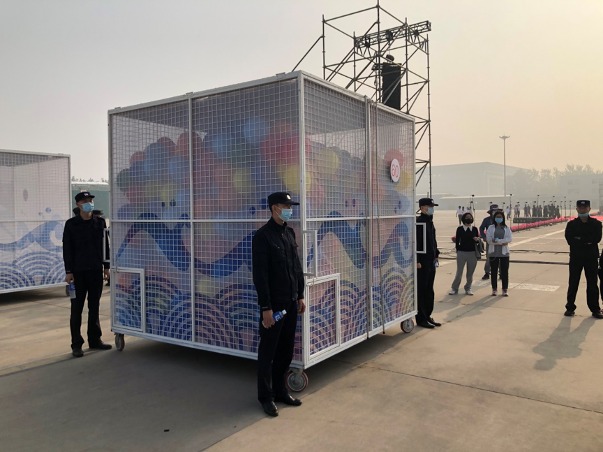 10万只气球,分布在100个球笼,每4人负责充满一个球笼,再加上气体保障和信号指挥人员,600人的团队分工明确。曹健表示,团队整齐划一的配合是整个气球放飞过程中最重要的一步。100个球笼依次排开,横跨了整个广场, 志愿者们只能通过信号员的旗语做出相应的动作。第一排先放,相隔大概几秒钟,第二排再接上,基本就能形成球幕的效果。旗语一起一落之间,大家要迅速、准确地做出相应的动作,但这是要长时间的训练磨合才能达到的。