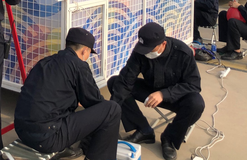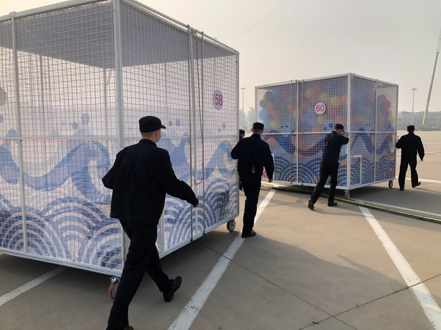 打气、装进球笼这些看似简单的重复性工作也不能有半点马虎。孙识政是来自北京警察学院的志愿者,他需要与同伴配合,一个充气,一个打结。为了严格保证气球大小、充气速度,一个动作他们每天需要练习几百次。