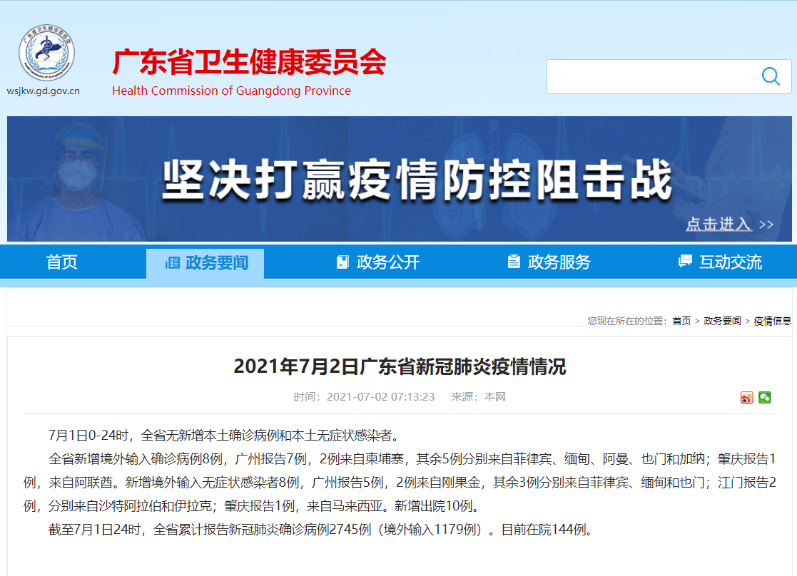 截至7月1日24时,广东省累计报告新冠肺炎确诊病例2745例(境外输入1179例)。目前在院144例。
