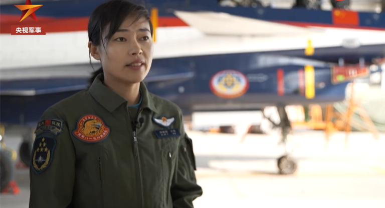 八一飞行表演队女飞行员何晓莉驾机带领编队飞过天安门。