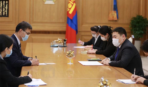 当地时间7月1日,蒙古国政府总理兼人民党主席奥云额尔登在乌兰巴托会见中国驻蒙古国大使柴文睿,祝贺中国共产党成立100周年。