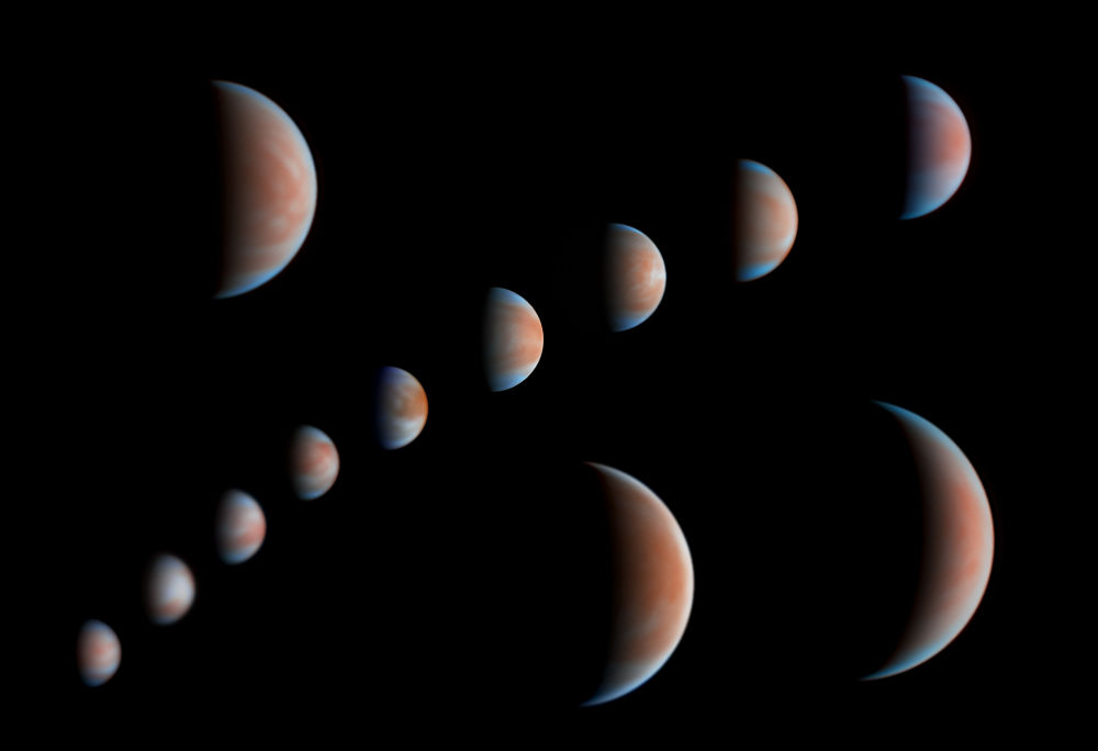 ↑北京市天文爱好者宗海阳2020年1月至4月拍摄的金星云带及相位变化(多张叠加)。(本人供图)