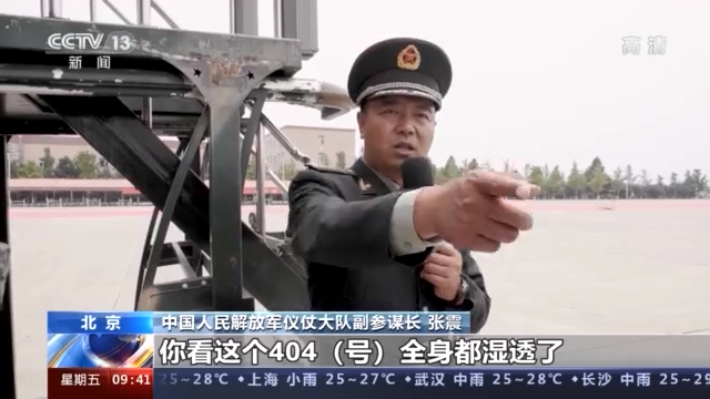 中国人民解放军仪仗大队副参谋长 张震:我看大家也是一身汗一身汗的。 你看这个404(号)全身都湿透了,确实还是不错的。应该讲大部分同志,衬衣都已经湿透了,领带都湿透了,但是你要对你的汗水负责任 你流那么多汗,最后说你不齐或者是说我们自己感觉不好,你对得起你的汗水吗?对得起我们今天一上午的辛苦努力吗?更多的不讲了,马上收操了,我希望我们这一趟走好。