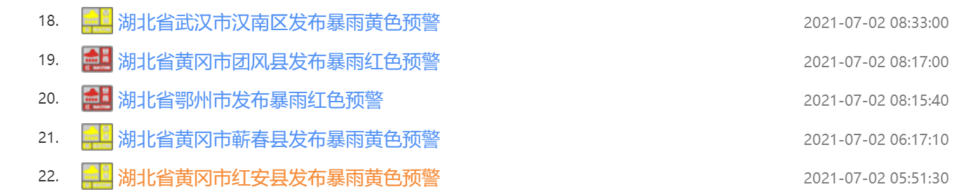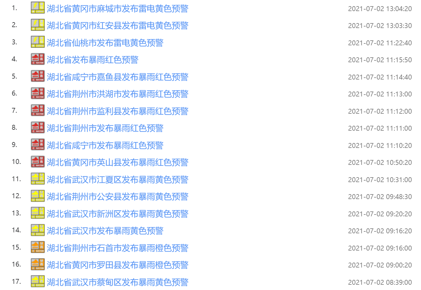 截至今天(7月2日)下午2时,湖北省气象局已经发布了22条天气预警。其中,武汉、鄂州、黄冈、荆州、咸宁等地发布了暴雨红色预警。