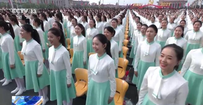 7月1日上午,天安门广场上传来耳熟能详的歌声。在广场中心表演区,3000名来自首都49所大中学校的学生用《唱支山歌给党听》《团结就是力量》《我们走在大路上》《社会主义好》《我们是共产主义接班人》《新的天地》《没有共产党就没有新中国》7首歌曲,拉开了庆祝中国共产党成立100周年大会暖场序幕。