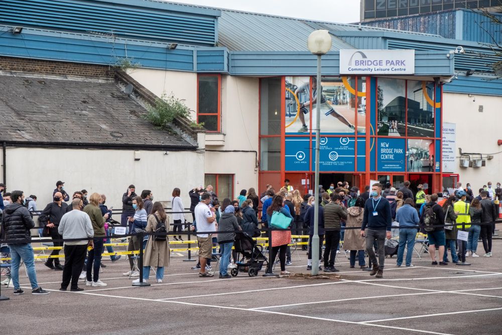 6月19日,人们在英国伦敦一家新冠疫苗接种中心外排队。新华社发(雷伊·唐摄)