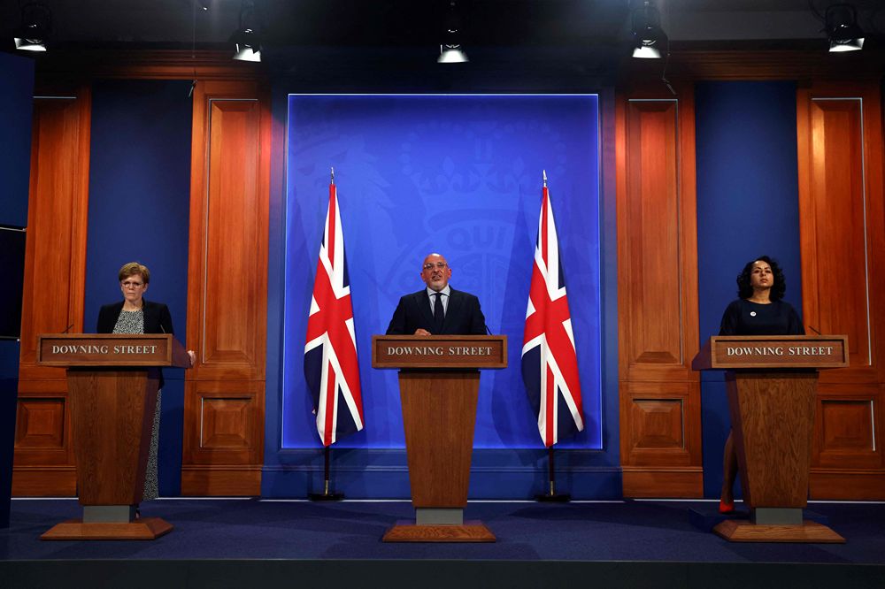 6月23日,英国政府分管新冠疫苗接种项目的官员纳齐姆·扎哈维(中)在伦敦举行的疫情发布会上讲话。新华社/法新