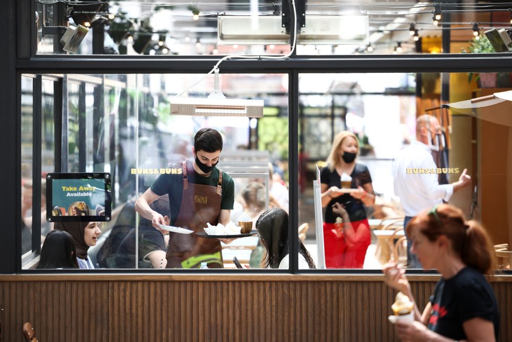 6月15日,服务生佩戴口罩在英国伦敦的一家餐厅工作。新华社/路透