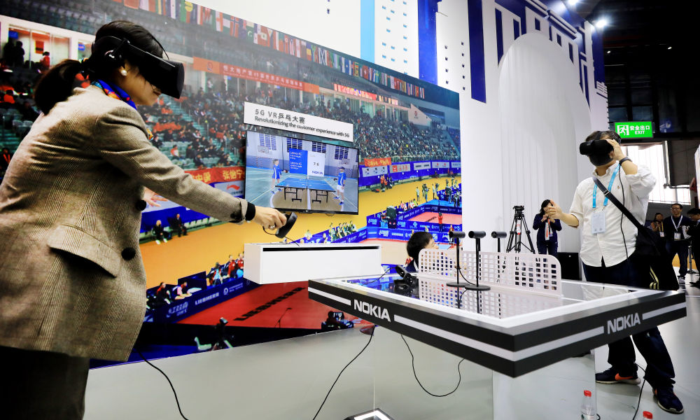 2019年11月7日,在第二届中国国际进口博览会装备展区,参观者在诺基亚展台体验5G VR乒乓赛。(新华社记者方喆摄)