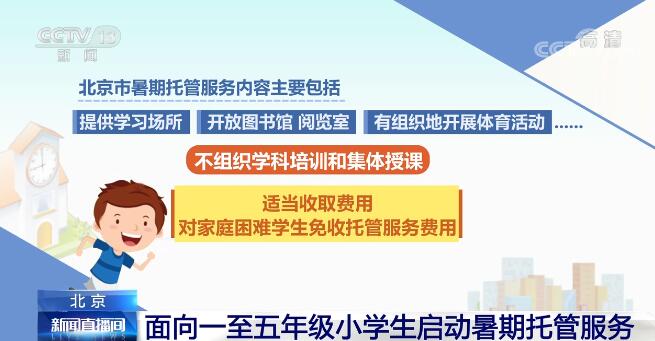据了解,北京市暑期托管服务内容主要包括提供学习场所,开放图书馆、阅览室,有组织地开展体育活动等。不组织学科培训和集体授课。适当收取费用,对家庭困难学生免收托管服务费用。