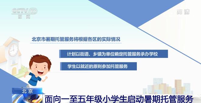 央视网消息:记者从北京市教委了解到,今年暑假期间,北京市将由各区教委组织面向小学一年级至五年级学生的托管服务。