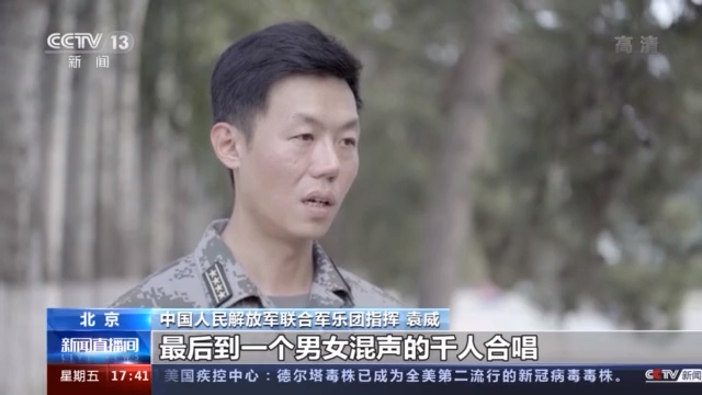 中国人民解放军联合军乐团指挥 袁威:因为《唱支山歌给党听》从最开始的童声演唱,就是然后再到中间的女声演唱,最后到一个男女混声的千人合唱,他是一个逐渐渐强的过程,音乐逐渐变得有张力,越来越坚定,让大家有一种跟着党走这种坚定感、信念感。那在乐队上,我的安排上也是乐队最开始是很轻,然后打击乐慢慢的铺进来,然后声乐慢慢的进来,最后达到一个非常高潮的,像颂歌一样《唱支山歌给党听》,也是前所未有的一个亮点。
